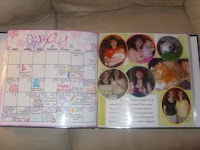 On the page opposite this running tally of events is the summary page. This came about as the result of a wall calendar my sister gave me for Christmas. The “top” page (where the picture should be) is actually a 12x12 background page for a scrapbook. When each month ends, I take the page down, add random pictures from the month that either didn’t fit onto a scrapped event page or didn’t have any other pictures to warrant a page of that event, and I journal about the highlights of the month.