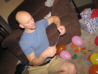 And then it was present time!!! He really liked popping open all the balloons. Braeya? Not so much. She didn't care for that activity. Most of the balloons contained verses I'd printed out...verses from A-Z I've been praying for my husband for many years - without having any idea who he was. I loved hearing him read them all. Some balloons had directions - like to dance to a song I'd picked out. Stuff like that. It was a lot of fun!