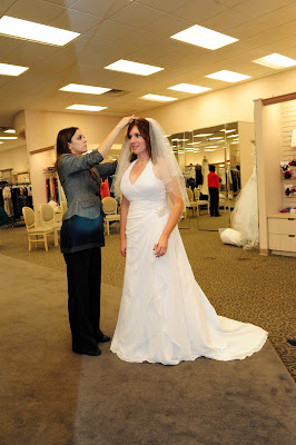 I made an appointment with David's Bridal in Fort Wayne and went in with a list of five dresses I'd seen online that I thought I might like. I was completely in love with one of them, but if I'd learned anything in Easter dress shopping, it was that anything that I adored online typically looked terrible on my person...so I went in with as open a mind as I could muster, willing to try on anything. Well. Almost anything. Nothing garish.