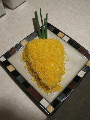 Ryan and I were invited to his family's get-together for Easter, and I really wanted to take something so we could feel we'd contributed to the meal. We weren't assigned anything, and I had this fear I'd make something and "take" someone else's signature dish, so I was excited to find this on Pinterest! The original pin has a recipe for a ranch/sour cream/bacon cheeseball, but I made the one I usually make - with cream cheese/green onion/dried beef. Then I shaped it into a carrot and covered it with shredded cheddar and used one remaining green onion for the green part at the top. We served ours with regular Ritz crackers and the whole thing was a huge hit with his family! WHEW!