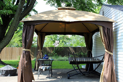 We decided to move ahead with our outdoor living space...and originally we planned to make a pergola like this one. In the end, lack of time and a pretty great gazebo at Lowe's made us change our mind, so ours looks a little different, but we love the privacy, the curtains, and the lights we will eventually add to match the one above!!
