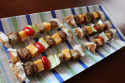 This pin was my inspiration, but I ended up going a bit of a different route with it...used meatballs instead of lunch meat - and added cheese and bun pieces to each end - to make a cheeseburger kabob for our 4th of July picnic!