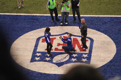 During one of the commercial breaks, we enjoyed watching a surprise proposal. She said yes! And about half a second later, they were booted off the field so the game could continue. :)