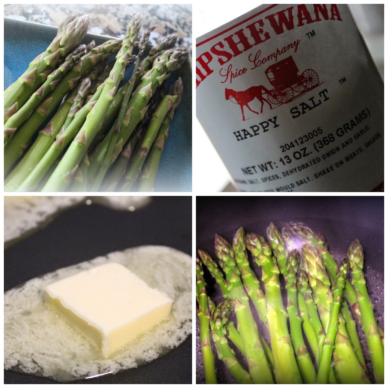 Thoroughly rinse the asparagus and break off the bottom of the stems. Boil water in a pan on the stove, and when it reaches a boil, carefully drop in the asparagus for one minute. Remove asparagus and transfer to a bowl of cold water momentarily. Remove from water and place in hot skillet with butter. Stir in with seasoned salt until asparagus is tender all the way through. Serve hot with meal.