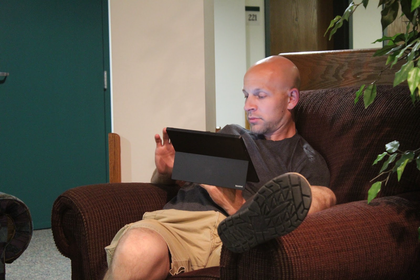 The last night we were together, we all hung out in one of the common areas at the hotel, gathered up some chairs and couches, and looked at each other's pictures. Ryan lost his seat on the couch with me so other people could peek over my shoulder at the family pics...and this is what I caught him doing across the way. Content as he could be on my tablet. :)