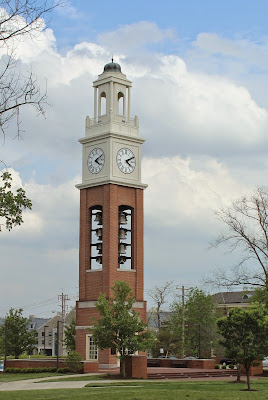 Our first slowdown was in Oxford, Ohio, where our GPS routed us right through the center of town. It's a college town, and it seemed to be graduation weekend. The place was PACKED with tourists in for graduation, parents there to load up their kids' stuff to take it home, and unending construction. But that gave us plenty of time to enjoy this very cool bell tower: