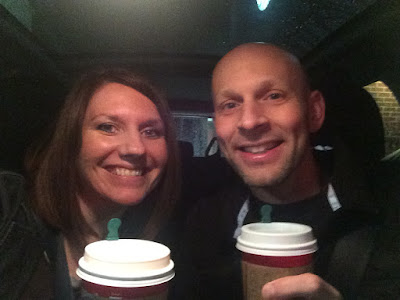 He came home in the cold and rain, with an early onset of dusk, thanks to the nasty weather, and we piled in the car to get some coffee fuel and get on our way.